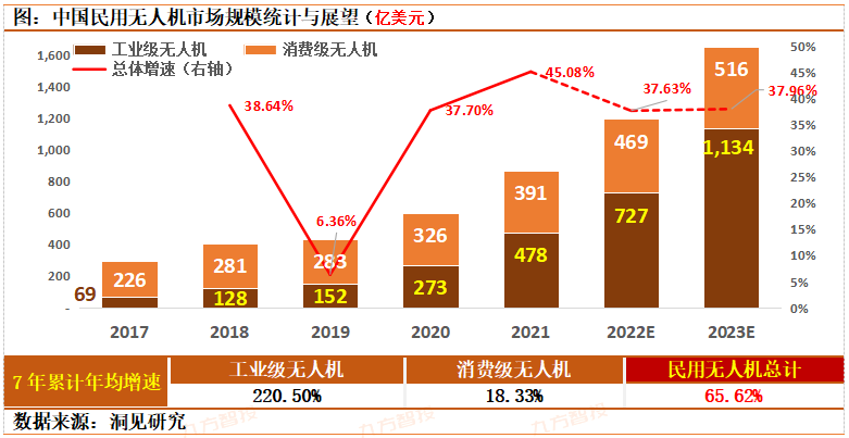 综合来看,我国在民用无人机领域不仅拥有着巨大的市场基础规模优势,还有着明确的企领军企业质量优势。与此同时,得益于国内政策体系聚焦建设以及应用场景持续拓展,中国民用无人机产业保持规范化加速发展趋势的基础可谓坚实。