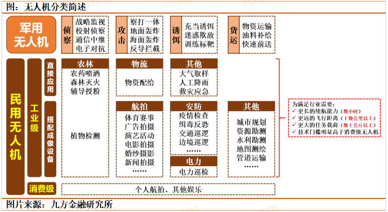 无人机又称无人飞行机器人,在实践生活中可以分为军用与民用两个大类;根据产品性能指标以及应用场景,民用无人机可以进一步划分为工业级与消费级。综合国内外实际情况来看,本次政策中提及的可以“转用军事”的“部分高规格高性能的民用无人机”应当主要指的是大多数工业级民用无人机以及少数高性价比消费级产品。从军事实践角度来看,将民用无人机专用军事的做法在本质上都是一种无奈的妥协。