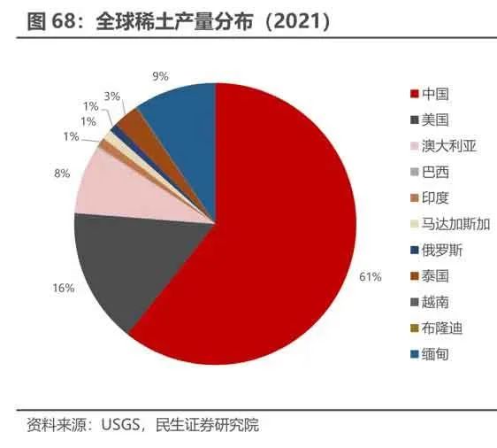 从产量看,据亚洲金属网统计,2021年全球稀土产量约为27.7万吨,中国稀土产量为16.8万吨,为世界第一,占比高达61%。