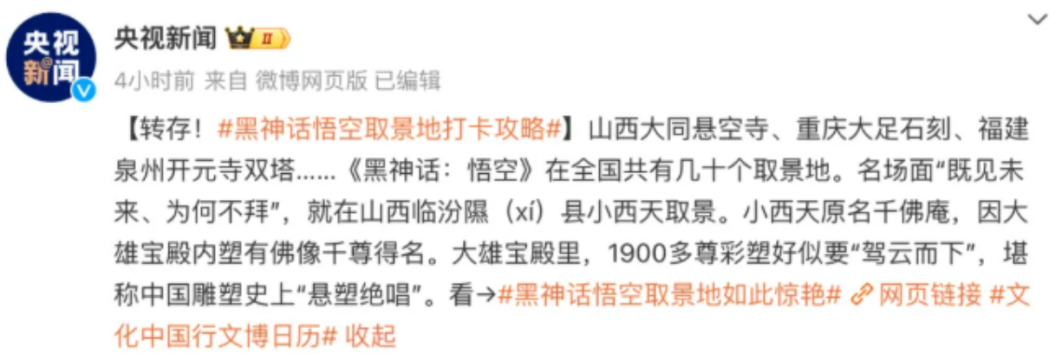周末,黑神话悟空销量超1000万份,再度霸屏热搜榜,同时,山西文旅也火了。连新华网等一众官媒也发文《这一次,不得不去山西了!》。