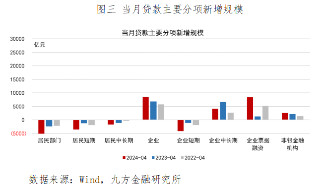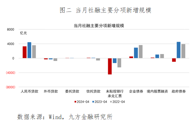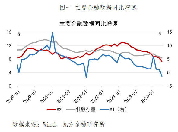 根据人民银行发布的数据,2024年4月新增社融规模为-1987亿元,新增人民币贷款规模为7300亿元,新增人民币存款规模为-3.92万亿元,社融、M1、M2同比增速分别为8.3%、-1.4%、7.2%,分别较上月下滑0.4、2.5、1.1个百分点。从几项主要指标的表现来看,4月的金融数据出现了加速走弱的迹象,其中单月新增社融更是创下了历史新低,且这也是有统计以来第二次单月新增社融为负。从分项数据来看,九方金融研究所宏观团队认为4月的金融数据中有以下几点值得关注: