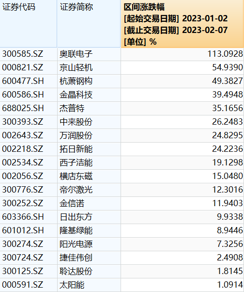 今年以来,钙钛矿电池概念股全线上涨。Wind数据显示,截至2月7日,奥联电子累计涨幅居前,超113%,京山轻机、杭萧钢构累计涨幅超40%。