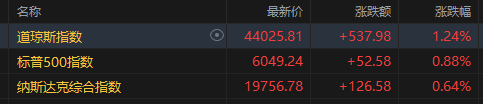 截至收盘,道琼斯指数涨1.24%,报44,025.81点;标普500指数涨0.88%,报6,049.24点;纳斯达克综合指数涨0.64%,报19,756.78点。