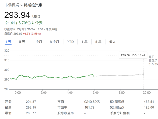 截至周一收盘,特斯拉股价下跌6.79%,报293.94美元,市值为9210亿美元。自去年12月创下历史新高以来,该股已累计下跌约35%。今年以来,特斯拉股价累计下跌22%,是美股“科技七巨头”中表现最差的。