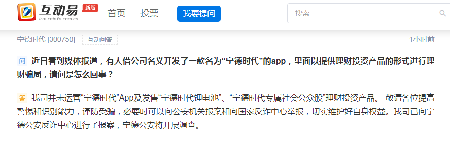 3月3日午间,宁德时代在互动平台表示,公司并未运营“宁德时代”App及发售“宁德时代锂电池”、“宁德时代专属社会公众股”理财投资产品。