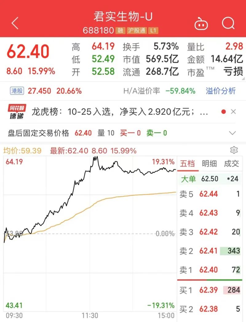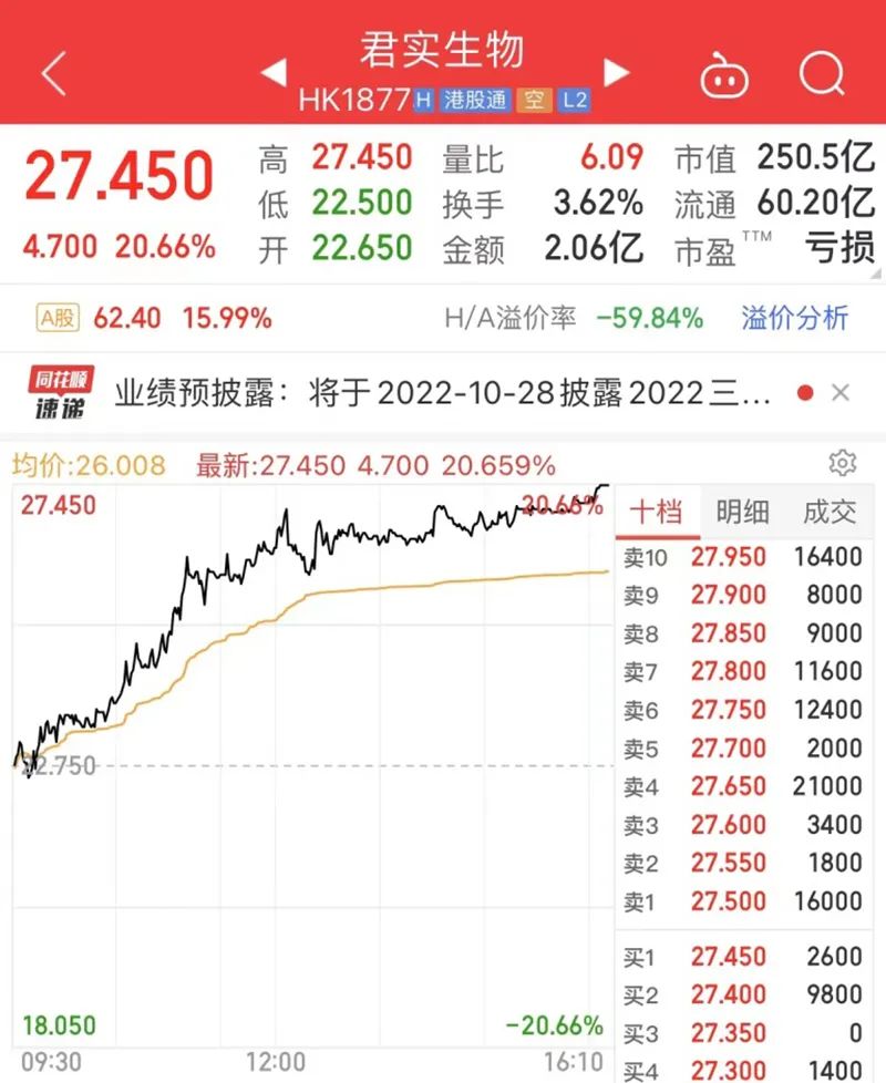 10月25日,君实生物A股、H股同时出现强势拉升,最终收盘涨幅分别为15.99%、20.66%。