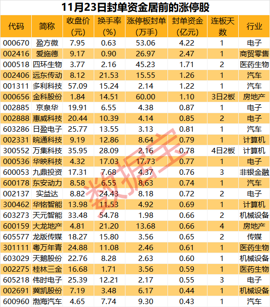 从收盘涨停板封单量来看,金科股份封单量最高,有60万手;其次是盈方微、四环生物、爱施德,涨停板封单分别为53.06万手、45.23万手、26.97万手。
