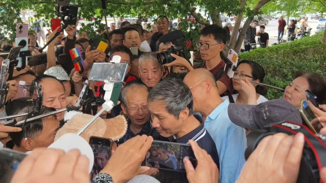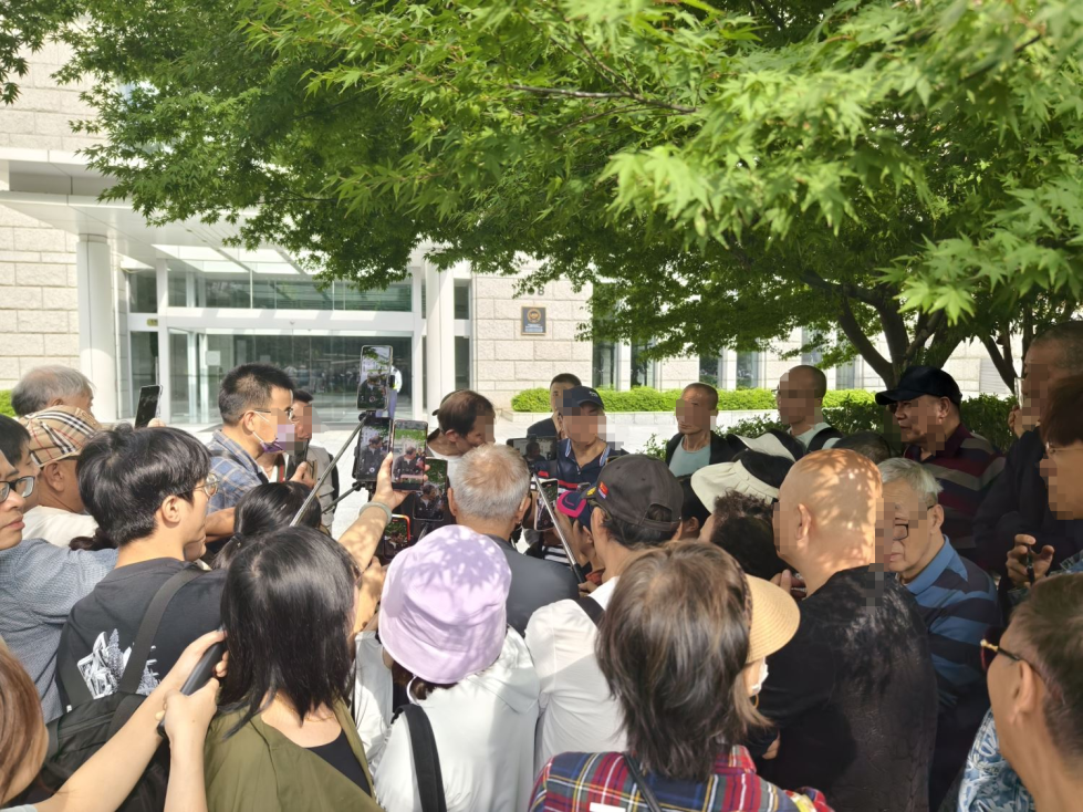 路人得知是“爱在深秋”本人在此,纷纷靠近围观,部分人流被挤到了旁边的写字楼门口。保安无奈,只能一次次告知“这里是车辆进出的,请不要占道……”。