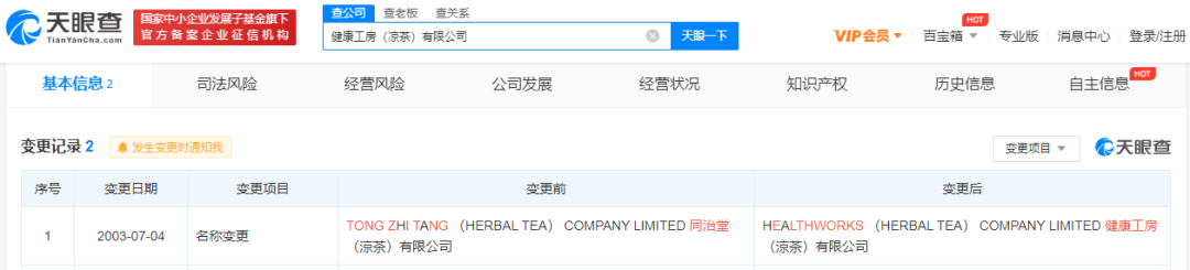 “健康工房”的前身是中国香港凉茶老品牌“同治堂”。天眼查官网显示,在中国香港注册的公司同治堂(凉茶)有限公司于2003年7月4日变更为健康工房(凉茶)有限公司。资料显示,同治堂的产品也由传统凉茶转为配合大众生活的健康饮品,同时开展包装饮料和凉茶店业务。