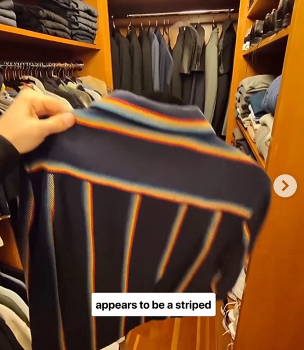 而扎克伯格也在社交平台上,发布多段视频及图片演示了本次更新。在其中一段视频中,他从衣帽间中拿出一件衬衫,要求智能眼镜推荐搭配的裤子。AI判断出这是一件条纹衬衫后,提供了几个可能搭配的裤子建议。