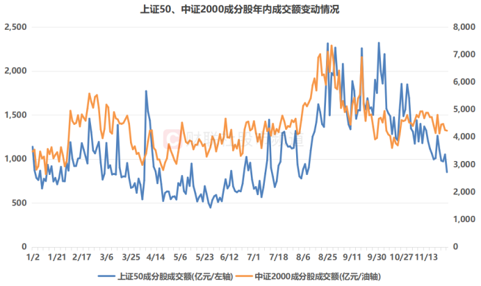 此外,从市值规模角度来看,权重股近期的成交额较小微盘股下降更为明显。以主要规模指数上证50、中证2000成分股统计,其两者今日成交额分别达850亿元、4229亿元,较年内均值水平(1067亿元、4348亿元)分别低20.4%、2.7%。其中,上证50指数成分股成交额今日时隔3个半月再度跌破900亿元,并创今年8月5日以来新低。