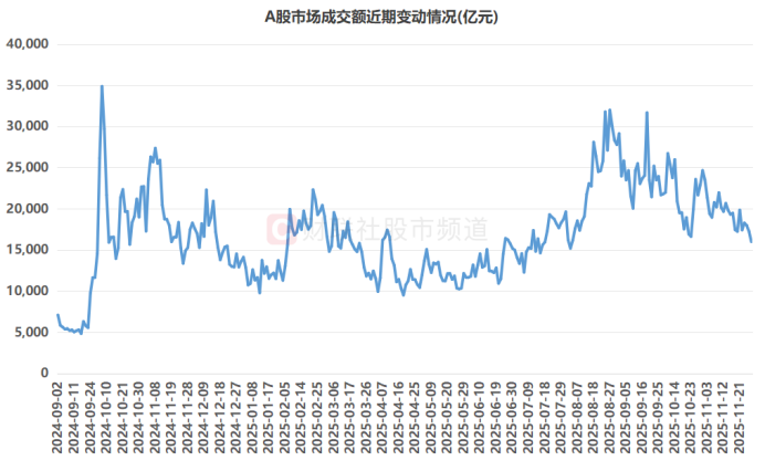 今日(11月28日),A股市场继续缩量,截至收盘,沪深京三市成交额1.598万亿元,较昨日减少1254亿元,同时创8月4日以来近4个月新低。目前,市场成交额已连续11个交易日未能重返2万亿元关口。