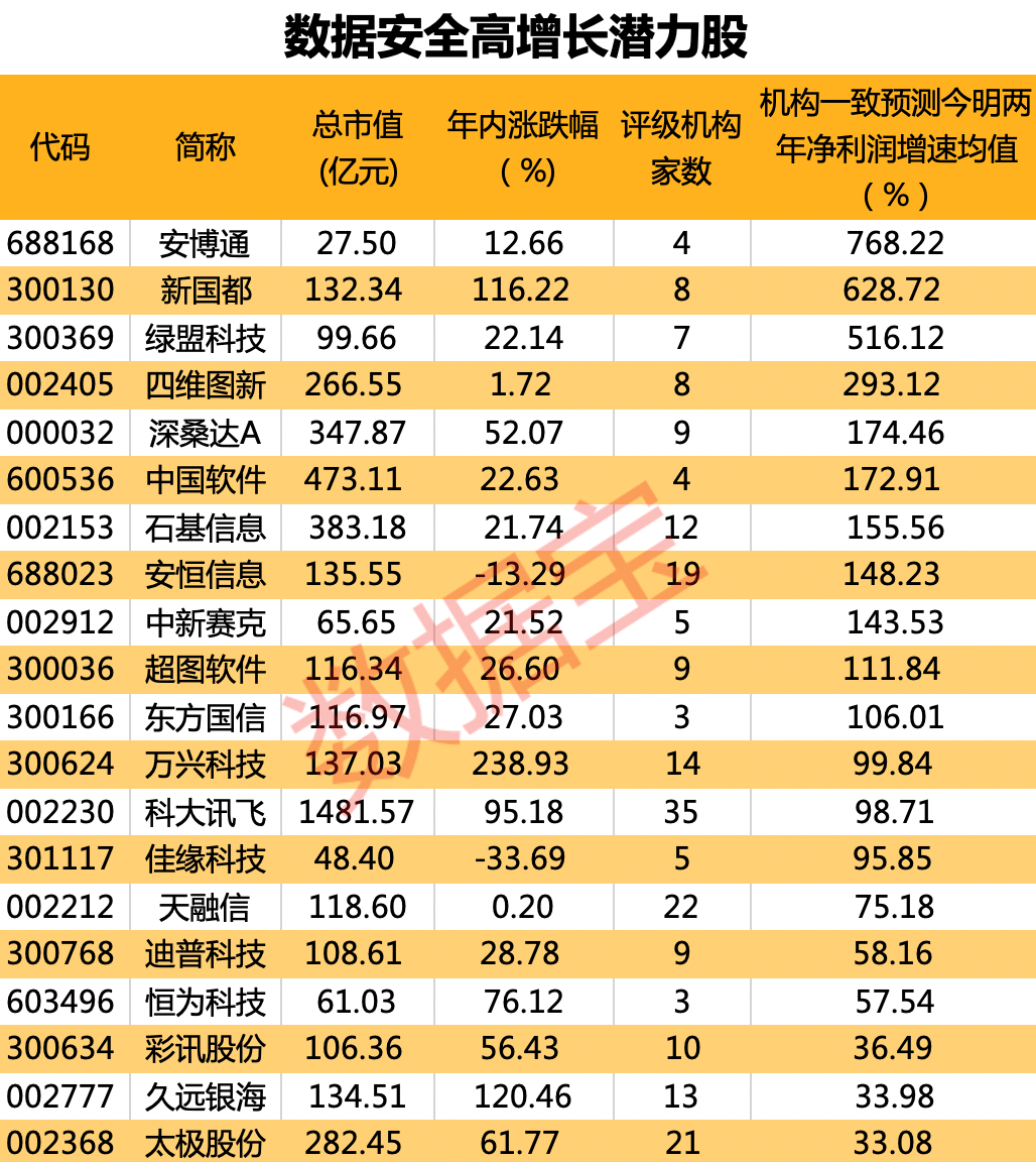 数据宝统计,根据3家及以上机构预测,安博通、新国都、绿盟科技等个股机构一致预测今明两年净利增速均超30%。