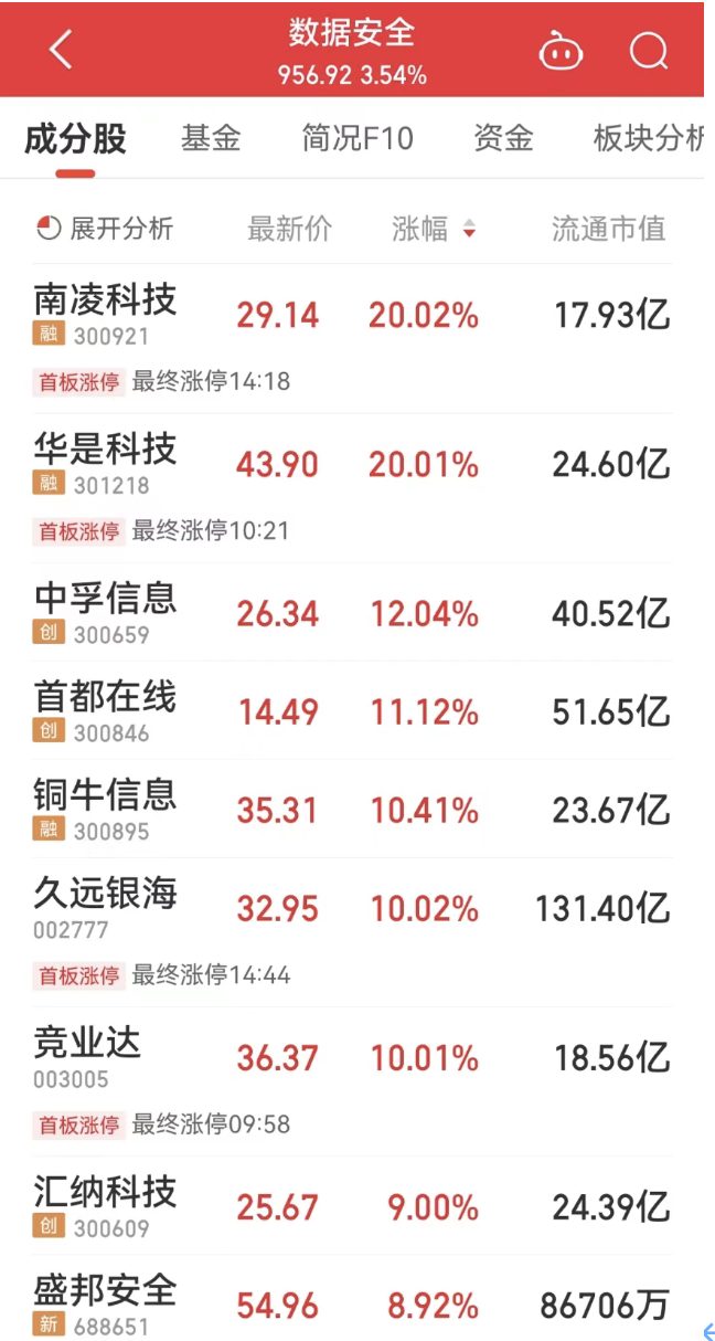 14日,数据安全概念板块上涨3.54%,南凌科技、华是科技均20cm涨停,久远银海、竞业达10cm涨停,首都在线、铜牛信息大涨超10%,汇纳科技、盛邦安全、深桑达A等多股跟涨。