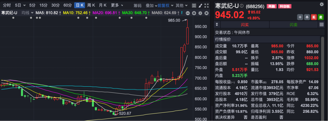 寒武纪早间继续放量大涨逾12%,截至午间收盘,股价突破900元,直指千元大关,市值则接近4000亿元,成为仅次于中芯国际的科创板第二大市值公司。
