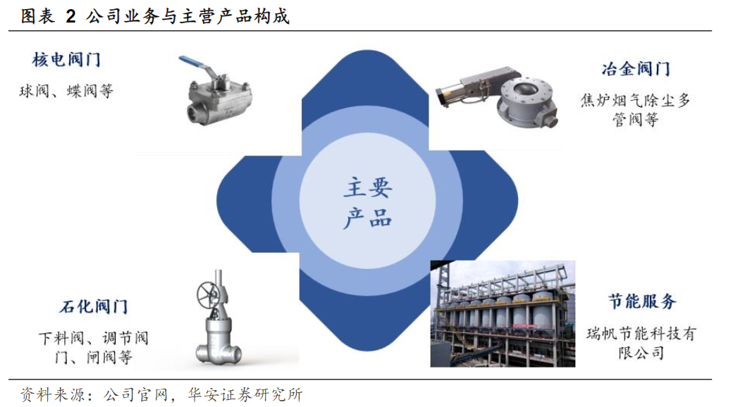 公司产品包括蝶阀、球阀、闸阀、截止阀、止回阀、调节阀等七个大类145个系列,涵盖2000多个规格,并广泛应用于冶金、核电、火电、煤化工、石油和天然气集输及石油炼化等领域。业务目前已拓展到能源化工、氢能、航天军工等行业,产品线延伸至乏燃料处理、节能服务和阀门维保后市场。
