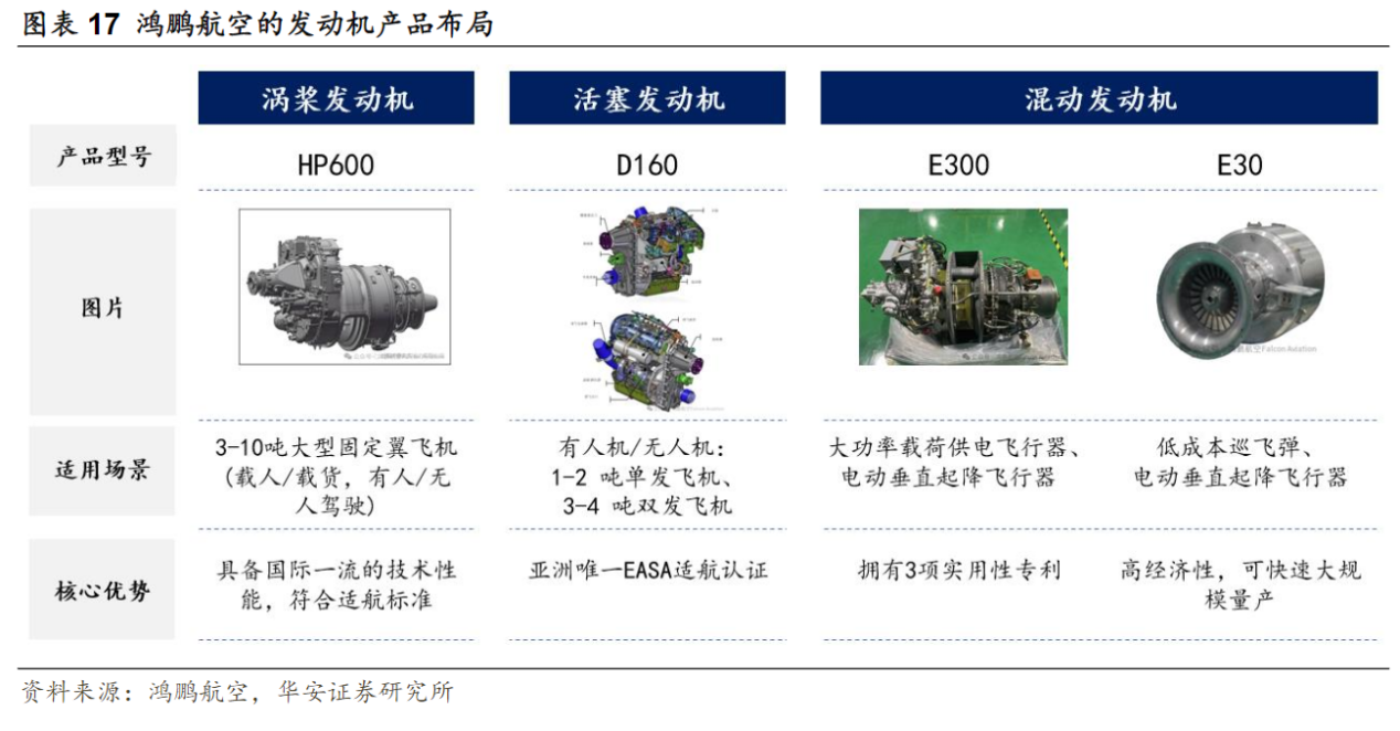 研报菌简评:鸿鹏的航空发动机产品包含活塞航空发动机、涡轮电混合动力航空发动机、涡桨航空发动机。