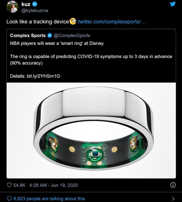 早在2020年,Oura Ring便和NBA达成了官方合作,NBA采购了2000多个Oura Ring戒指提供给所有参加复赛(因为疫情而中断的常规赛和季后赛)的球员和工作人员,这让Oura Ring一夜之间拥有了几乎所有的NBA顶级明星球员用户。