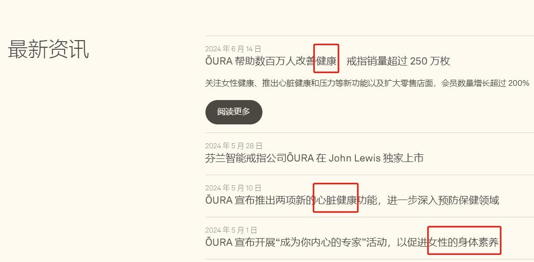 Oura Ring公司的资讯页,就产品功能而言,着墨最多的是“健康”