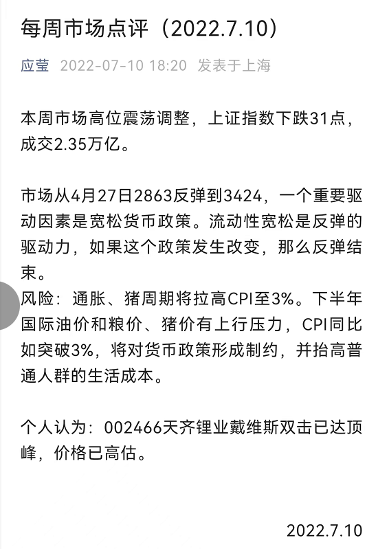 7月10日,应莹在微博再度发布《每周市场点评》。文末提到了近期大热股天齐锂业。