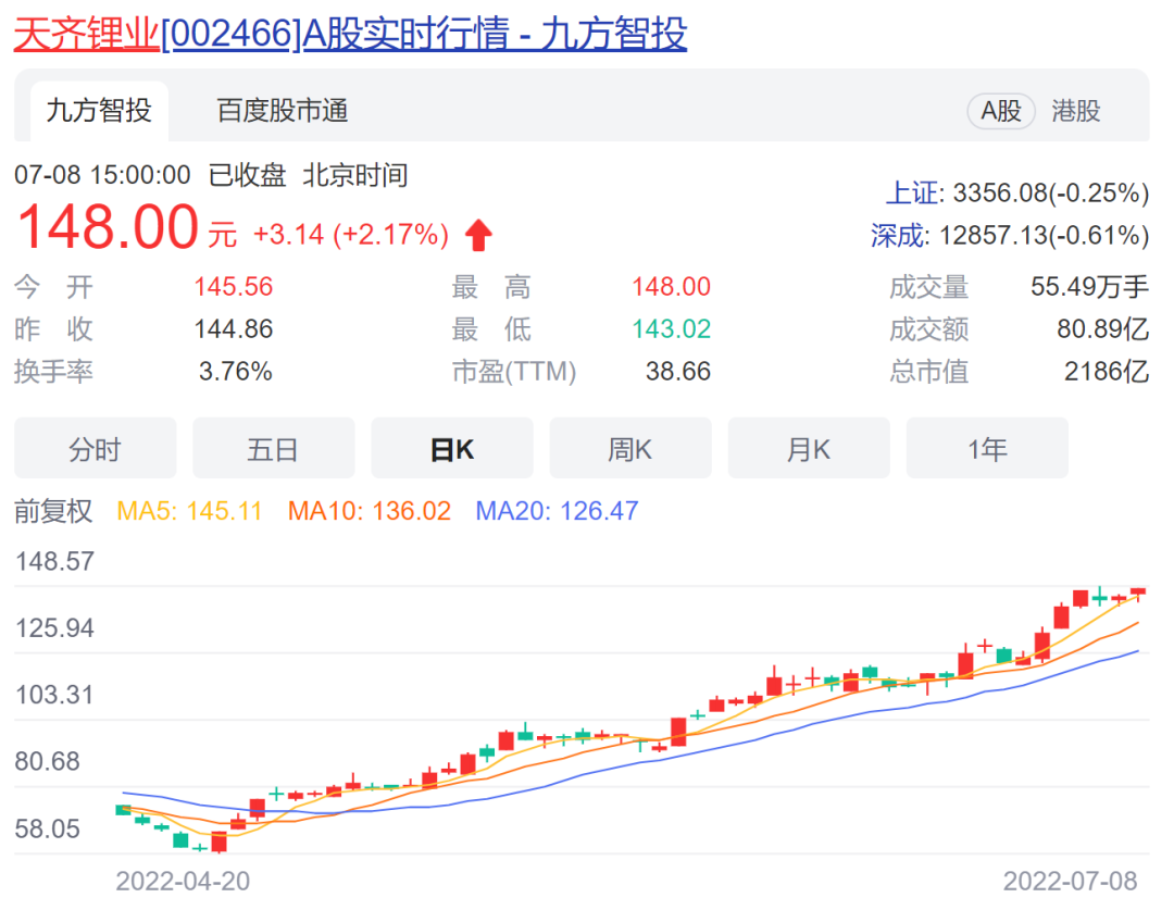 在此前的一段时间,天齐锂业在A股市场的表现相当可观。上周更是创出历史新高148.57元,最新价为148元,自4月底以来,反弹幅度高达155%,目前市值2186亿元。