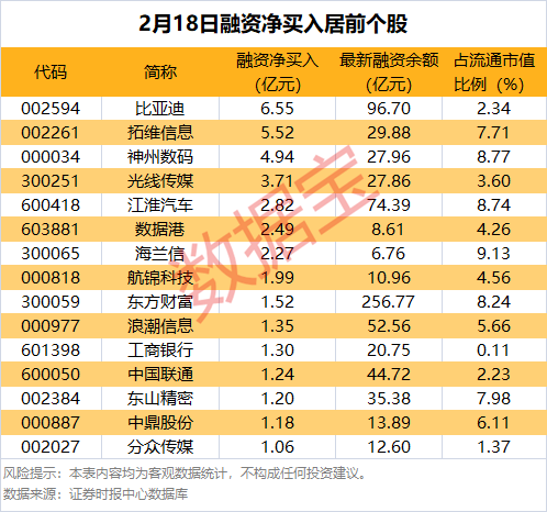 具体到个股,2月18日获融资净买入千万元以上的有349只,其中15只融资净买入额超亿元。比亚迪融资净买入额居首,当日净买入6.55亿元,其次是拓维信息、神州数码,融资净买入金额分别为5.52亿元、4.94亿元,融资净买入金额居前的还有光线传媒、江淮汽车、数据港等。
