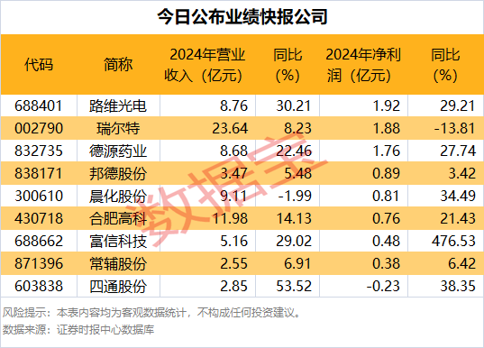 2月19日,9家公司发布业绩快报,四通股份、路维光电、富信科技等2024年营业收入增幅超20%。从净利润来看,有8家公司实现盈利,路维光电、瑞尔特、德源药业2024年净利润均超亿元,四通股份2024年亏损2304万元,但亏损额同比大幅减少。