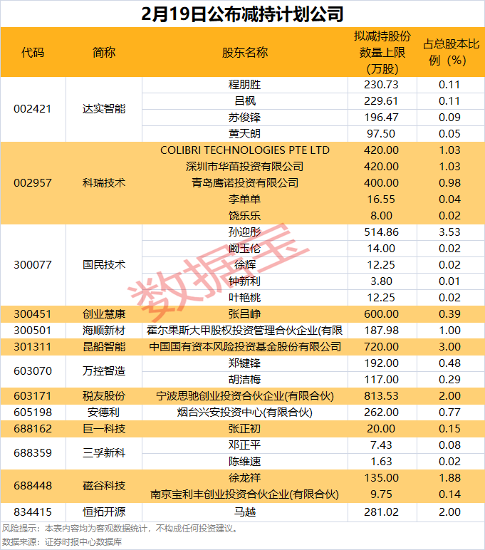 2月19日共有13家公司披露股东减持计划,拟减持股份比例较高的有科瑞技术、昆船智能等。