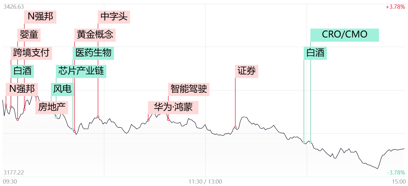 市场全天震荡下挫,沪指盘中一度跌破3200点,创业板指领跌。沪深两市全天成交额1.57万亿元,较上个交易日缩量5710亿。盘面上,跨境支付概念股逆势大涨,四方精创、科蓝软件、小商品城、青岛金王等涨停。三胎概念股盘中活跃,西部牧业、金发拉比、大东方涨停。券商股一度冲高,中金公司、红塔证券、海通证券、国泰君安涨停。高位股盘中展开修复,珂玛科技涨停,润和软件涨超10%。下跌方面,芯片股持续调整,国民技术等多股跌超10%。整体上个股跌多涨少,全市场超4800只个股下跌。截至收盘,沪指跌2.55%,深成指跌3.92%,创业板指跌5.06%。