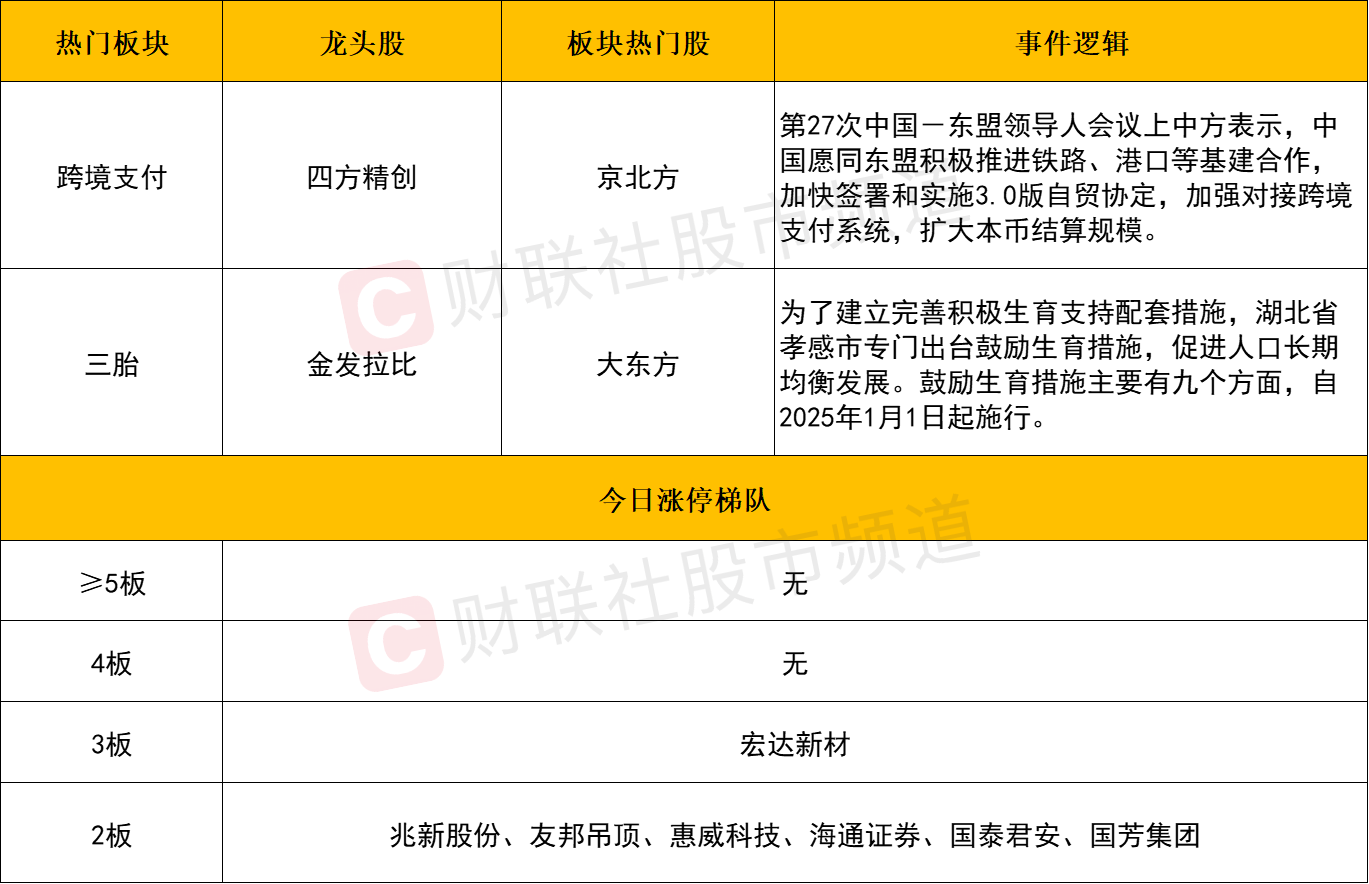 板块上,跨境支付涨幅居前,四方精创、科蓝软件、青岛金王、京北方、中油资本、小商品城等涨停。消息面上,第27次中国-东盟领导人会议上中方表示,中国愿同东盟积极推进铁路、港口等基建合作,加快签署和实施3.0版自贸协定,加强对接跨境支付系统,扩大本币结算规模。