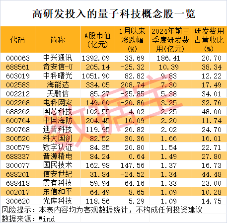 据数据宝统计,今年前三季度,量子科技概念股合计研发费用达到401.87亿元,占营收比例为6.98%。34股研发费用超1亿元,且研发费用占营收比例超10%的股票有17只。