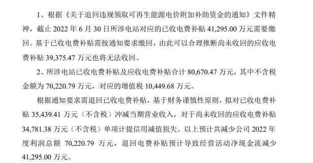 公告披露,公司拟对已收电费补贴3.54亿元(不含税)冲减当期营业收入,对于尚未收回的应收电费补贴3.48亿元(不含税)单项计提信用减值损失。预计共减少公司2022年度利润总额7.02亿元,退回电费补贴预计导致经营活动净现金流减少4.13亿元。