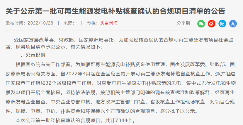 10月28日,信用中国网站发布《关于公示第一批可再生能源发电补贴核查确认的合规项目清单的公告》。经可再生能源发电企业自查、中央企业总部审核、地方政府主管部门审查、省级核查工作组现场核查,对项目合规性、规模、电量、电价、补贴资金和环保等六个方面确认的合规项目,将分批予以公示,第一批经核查确认的合规项目共计7344个。