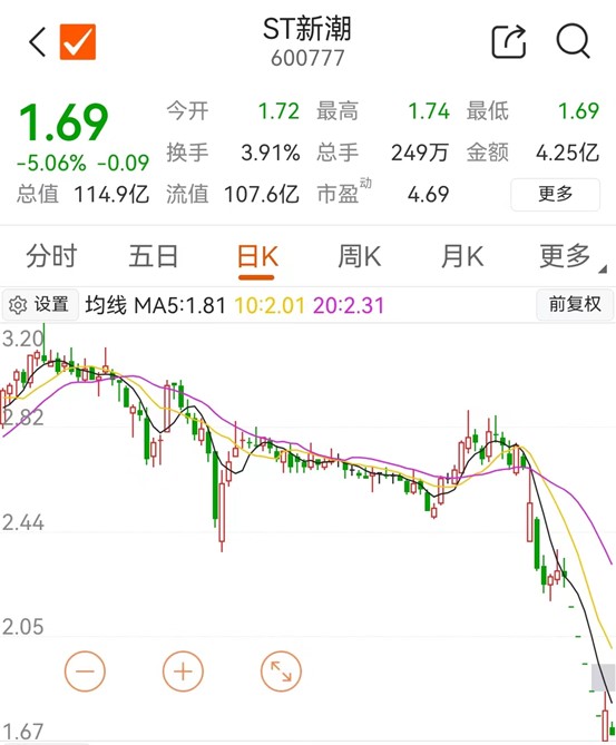 股价走势来看,ST新潮自被戴帽后,股价跌跌不休,今天再度跌停,收1.69元,自4月30日至5月13日7个交易日内,已跌去了25.55%。