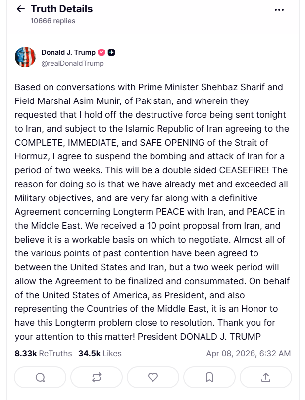 特朗普在社交平台发文称,在与巴基斯坦总理夏巴兹·谢里夫及陆军参谋长阿西姆·穆尼尔通话后,应巴方请求,美方决定暂缓原计划针对伊朗的军事打击行动,为期两周,前提是伊朗同意全面、立即且安全地开放霍尔木兹海峡。