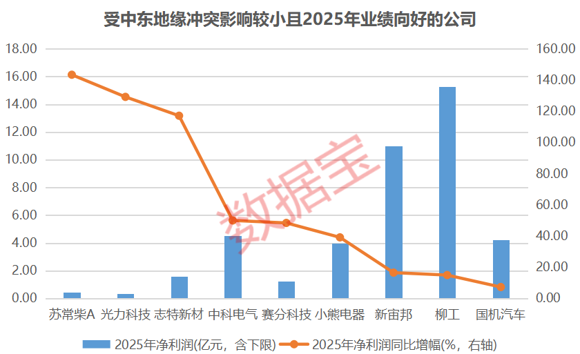 从业绩来看,上述受中东地缘冲突影响较小的公司中,有15家公司披露2025年业绩(含预告,预告取下限数据),其中9家公司业绩实现增长(含扭亏类型)。