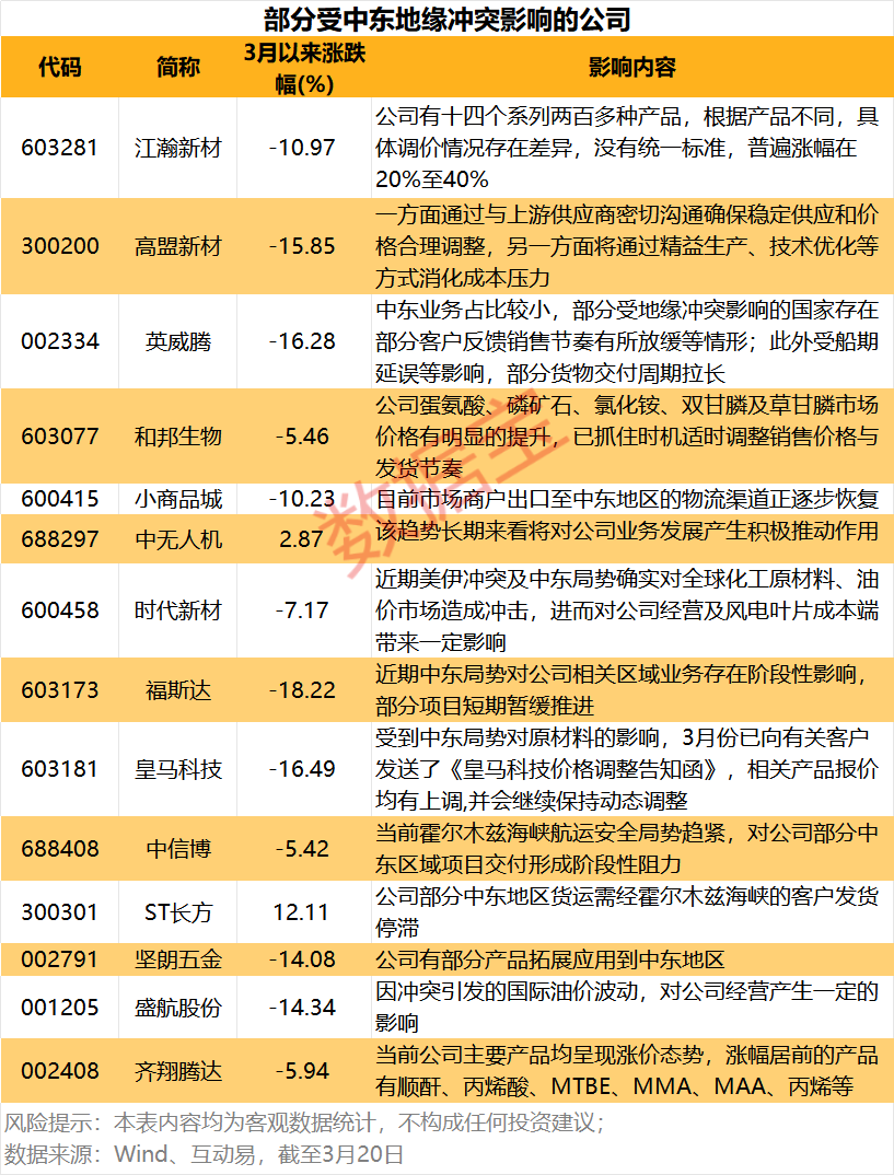 中东地缘冲突持续升级,霍尔木兹海峡航运受阻,石油化工、钢铁建材、有色金属以及航运等多个行业板块均受到不同程度影响。3月份以来,投资者最为关心“公司是否有产品销往伊朗或者中东”“中东局势对公司影响如何”等,上市公司通过公开渠道积极回复关切。