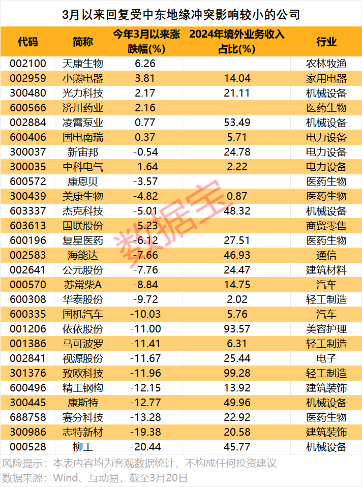 上述近30家回复中东地缘冲突影响较小的公司,主要分布于机械设备、医药生物、轻工制造、电力设备等行业。