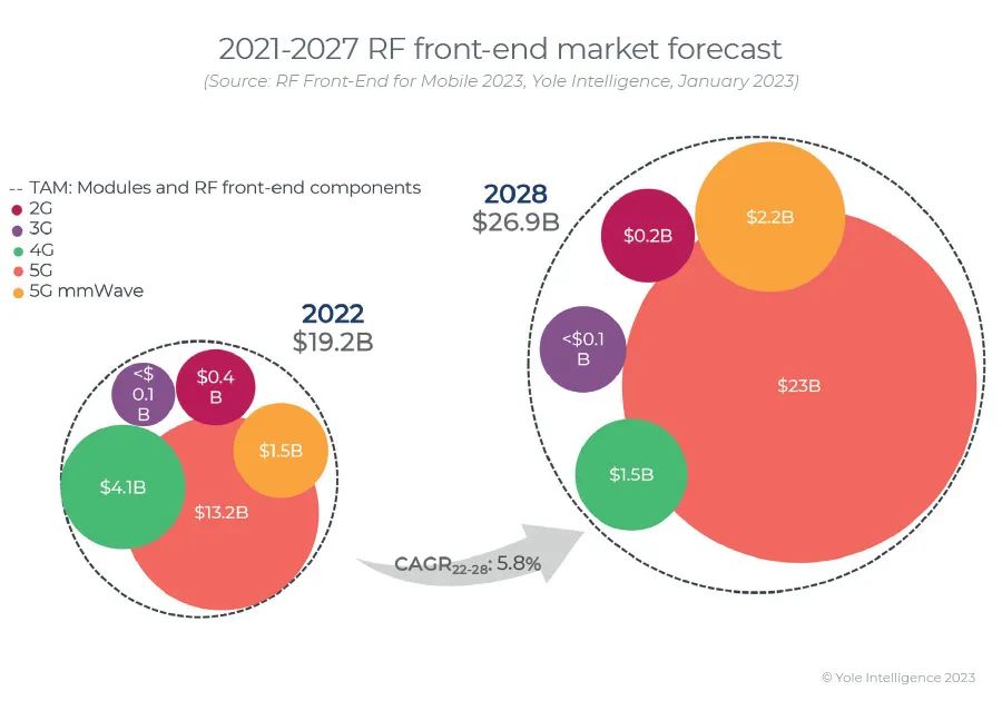 随着5G等通信技术的迅猛发展,对射频前端器件的需求激增。市场分析人士指出,智能手机市场有望迎来持续下行周期后的见底复苏,未来国内优质射频厂商有望扩大市场份额,成长空间广阔。根据Yole的数据,2021年射频前端的市场为190亿美元以上,预计到2028年射频前端的市场年复合增长率约为5.8%,将达到269亿美元。