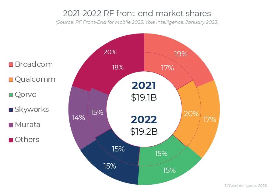 更为困难的是,射频芯片领域马太效应凸显,美系和日系厂商占据了主导地位。Yole数据显示,美国的思佳讯(Skyworks)、博通(Broadcom)、威讯联合半导体(Qorvo)、高通(Qualcomm)和日本的村田(Murata)五家厂商的产品在2021年和2022年占据了超过80%的市场份额。