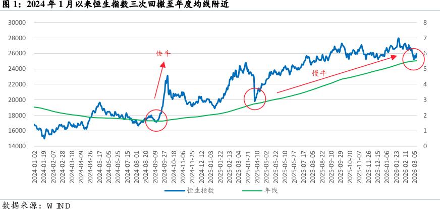 自2024年1月22日触及阶段低点以来,港股市场开启新一轮上行周期。经历初期高波动阶段后,当前已步入稳健上涨的“慢牛”格局。恒生指数近期回调至250日均线后企稳,历史经验表明,此前两次年线支撑均孕育新一轮升势。