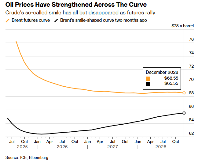 近月布伦特原油价格一度暴涨13%,远月合约价差也同步上扬。持续数月的期货曲线"微笑形态"(即近低远高的Contango结构,暗示长期供需宽松)已基本消失。