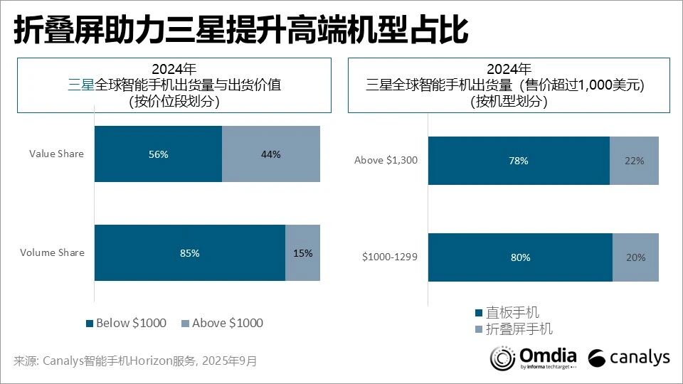 三星的产品组合很好地说明了这一点。一台 Galaxy Z Fold7 按官方售价(约 1,899 美元)出售,其收入相当于大约15部入门级 Galaxy A06 4G 的收入。2024年,三星全球售价超过1,000美元的智能手机(Galaxy S 和 Z 系列)仅占销量的15%,但这些机型贡献了惊人的44%出货价值。在这一价位段中,折叠屏(Galaxy Z 和 W 系列)占比超过20%,有效提升了平均销售价格(ASP),并将三星的收入结构从低利润、高竞争的大众市场中部分转移。此外,这还未计算可通过额外产品(如保障计划)实现的潜在加售机会销售。