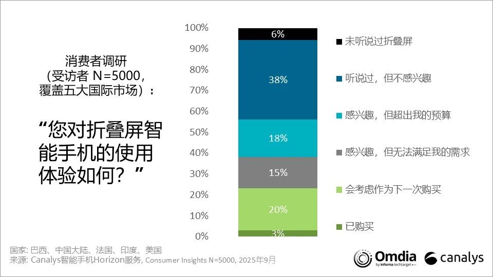 折叠屏已在全球范围内获得广泛关注。Canalys(现并入Omdia)在五个全球市场进行的一项消费者研究(样本量 N=5000),聚焦前沿智能手机技术显示,96%的受访者对折叠屏智能手机有一定程度的了解。然而,近 40% 的受访者表示对折叠屏不感兴趣,超过三分之一的受访者虽有兴趣,但认为折叠屏价格超出预算或无法满足自身需求。