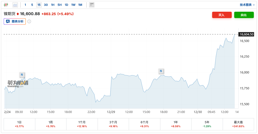 受全球最大生产国印尼计划削减供应的提振,镍价触及九个月以来的最高水平。截至发稿,LME镍期货涨超5%,报16600.88美元/吨。据报道,印尼能源和矿产资源部长Bahlil Lahadalia表示,为更好地匹配供需,2026年将减少镍产量。