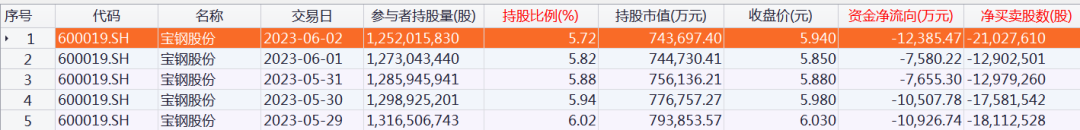 宝钢股份为本周北向资金减仓金额最高的个股,北向资金对宝钢股份的持股数减少8260.34万股,减仓金额达4.91亿元。从明细数据来看,北向资金连本周续5个交易日减仓宝钢股份,其中5月29日、5月30日、6月2日减仓均超1亿元。