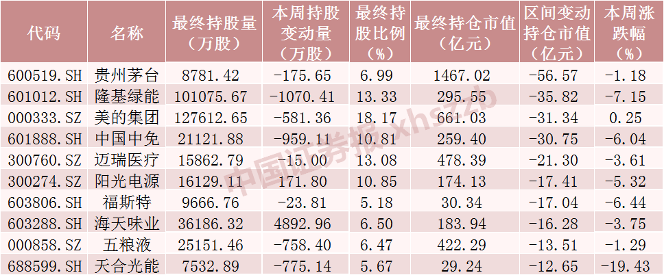 从市场表现上看,本周北向资金持仓市值减少额居前十的股票中,除美的集团上涨0.25%外,其他股票均下跌,天合光能跌幅最大,本周下跌19.43%。
