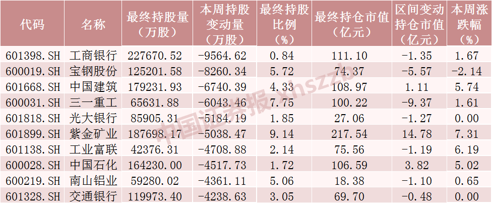 从市场表现上看,本周北向资金减仓股数前十的股票中,仅有宝钢股份下跌2.14%;光大银行、交通银行收平;其他股票均上涨,紫金矿业涨幅最大,本周上涨7.31%。