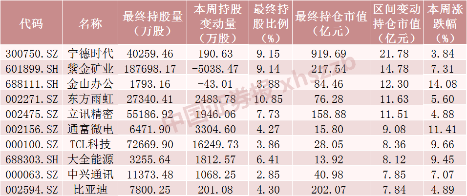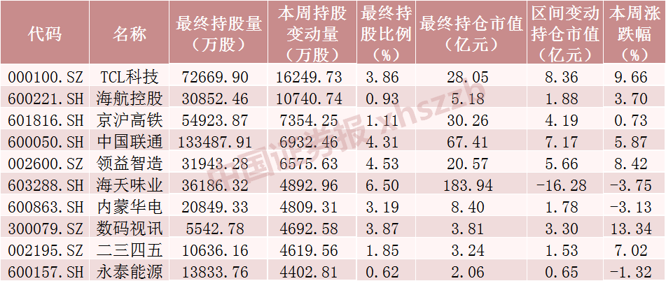 从市场表现情况看,本周北向资金持股增加数居前十的股票涨多跌少,海天味业跌幅最大,下跌3.75%;数码视讯涨幅最大,上涨13.34%。