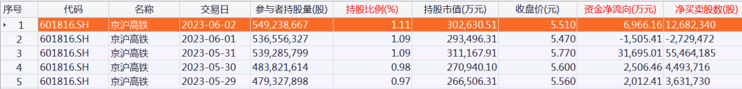 Choice数据显示,截至6月2日,北向资金持有京沪高铁5.49亿股,京沪高铁股价为5.51元/股,总市值为2706亿元。